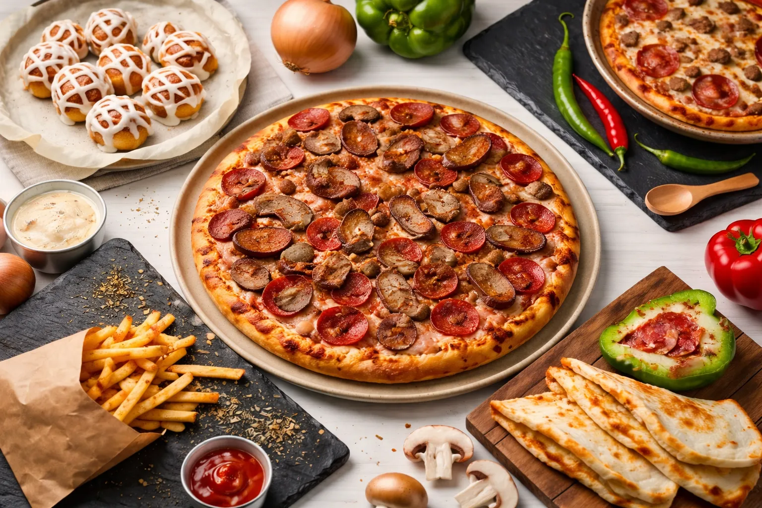 Freshly made pizzas with dough prepared daily, hand-picked vegetables and premium meats — loaded to the edge. Build your own pizza, enjoy crispy wings, pasta, keto-friendly dishes and more. Open daily 11 AM – 4 AM on Portage Avenue. Dine-in, takeout, or in-house delivery.
