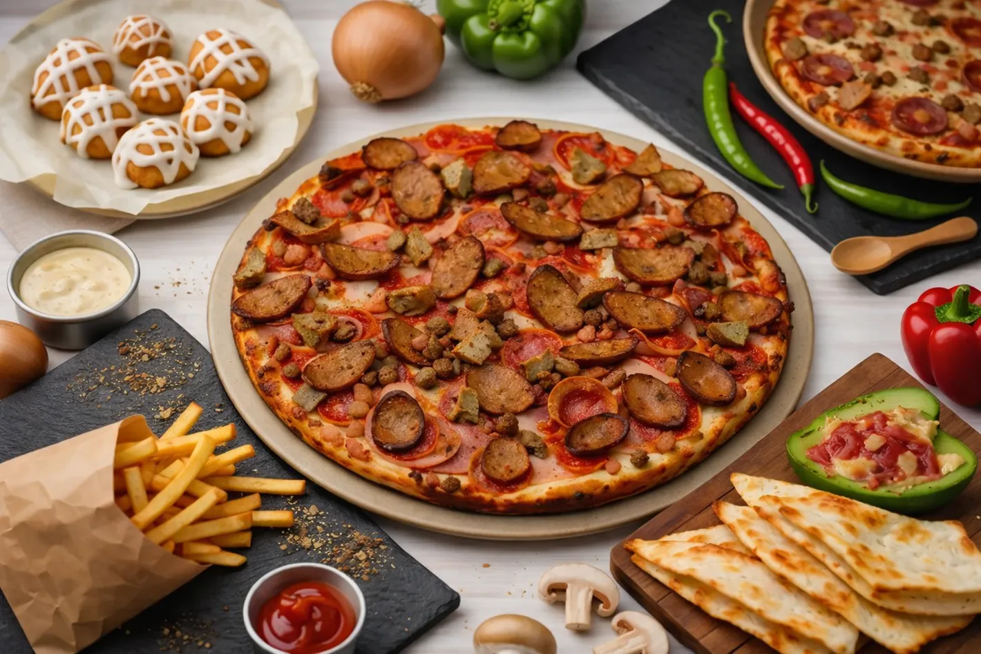 Freshly made pizzas with dough prepared daily, hand-picked vegetables and premium meats — loaded to the edge. Build your own pizza, enjoy crispy wings, pasta, keto-friendly dishes and more. Open daily 11 AM – 4 AM on Portage Avenue. Dine-in, takeout, or in-house delivery.